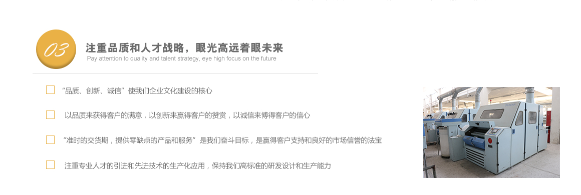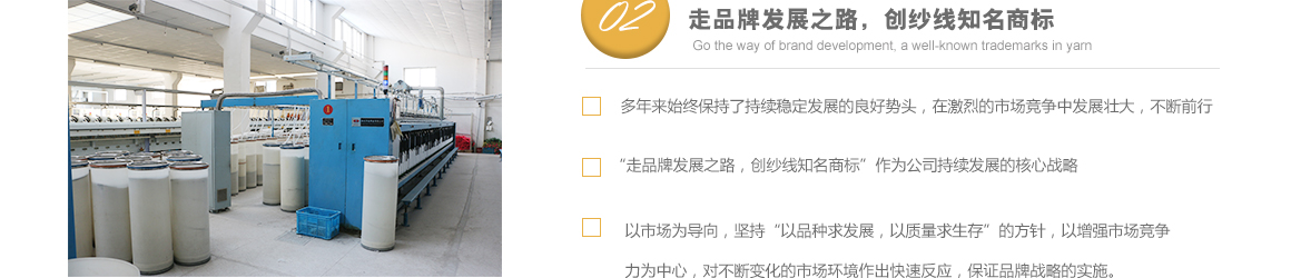 太倉市高陽工貿(mào)有限公司是專業(yè)從事特種紗生產(chǎn)十?dāng)?shù)年的一線生產(chǎn)廠家,坐落于江蘇省蘇州市太倉市雙鳳鎮(zhèn)新湖建湖路29號,太倉隸屬長江三角洲經(jīng)濟(jì)圈,交通便捷,經(jīng)濟(jì)發(fā)達(dá),是著名的紡織生產(chǎn)基地。 公司歷史要追溯到1982年就成立的新湖毛紡織廠。1996年,毛紡織廠與上海二十二棉在新湖聯(lián)合組建了太倉市新湖福利綜合廠。2002年為適應(yīng)市場的飛速變化,公司轉(zhuǎn)制重組更名為太倉市高陽工貿(mào)有限公司。同時公司適時調(diào)整生產(chǎn)經(jīng)營策略,調(diào)整產(chǎn)品品種結(jié)構(gòu),把生產(chǎn)特種紗作為主要發(fā)展方向,純棉、滌綸竹節(jié)紗是我們的主要產(chǎn)品。 公司多年來始終保持了持續(xù)穩(wěn)定發(fā)展的良好勢頭,在激烈的市場競爭中發(fā)展壯大,不斷前行。我們把“走品牌發(fā)展之路,創(chuàng)紗線知名商標(biāo)”作為公司持續(xù)發(fā)展的核心戰(zhàn)略。以市場為導(dǎo)向,堅持“以品種求發(fā)展,以質(zhì)量求生存”的方針,以增強(qiáng)市場競爭力為中心,對不斷變化的市場環(huán)境作出快速反應(yīng),品牌戰(zhàn)略的實施。公司注重專業(yè)人才的引進(jìn)和先進(jìn)技術(shù)的生產(chǎn)化應(yīng)用,具備較強(qiáng)的研發(fā)設(shè)計和生產(chǎn)能力。 公司一直把“品質(zhì)、創(chuàng)新、誠信”作為企業(yè)文化建設(shè)的核心。以品質(zhì)來獲得客戶的滿意,以創(chuàng)新來贏得客戶的贊賞,以誠信來博得客戶的信心。我們把“準(zhǔn)時的交貨期,提供零缺點的產(chǎn)品和服務(wù)”作為奮斗目標(biāo),贏得了客戶的支持和良好的市場信譽(yù)。 高陽工貿(mào)有限公司愿與廣大客戶加強(qiáng)合作,共享信息,迎接挑戰(zhàn),共同發(fā)展??蛻粜枨?。了解詳細(xì)>>